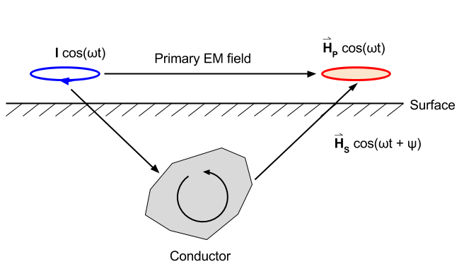 If the primary field is harmonic with frequency \(\omega\) then the secondary field is also harmonic. The secondary field will have a different phase than the primary; it will lag the primary field by angles between 90° and 180°. The amount of phase difference is diagnostic of the conductivity of the body.