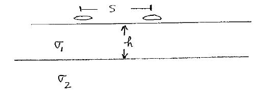Under the assumption that \(s << \delta\) then the above formulae can be used to predict the apparent conductivity from a multilayered earth, or to used measured apparent conductivities to estimate the individual layer thickness and conductivities. For instance if we coplanar coils on the earth’s surface given below