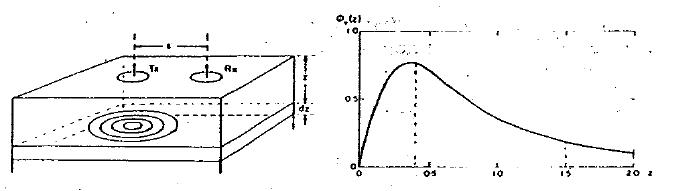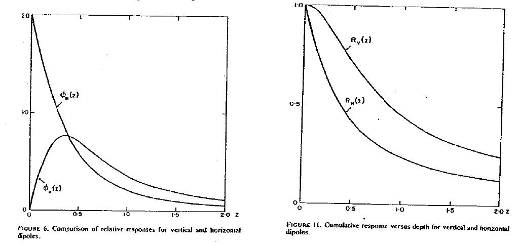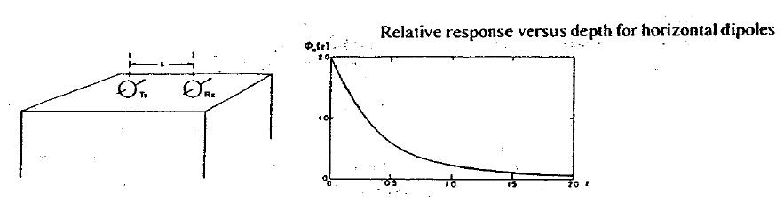 A depth of investigation might be defined as that depth below which only 25% of the signal arises. According to this rule the depth of investigation for the vertical dipole is about 2.0 s while the depth for the horizontal dipole is only half that amount.