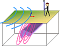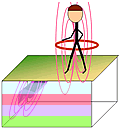 The EM terrain conductivity survey discussed above is a simple form of frequency domain EM (FEM). More sophisticated FEM surveys involve using multiple frequency and/or coil configurations. Surveys can be carried out on the ground or from airborne platforms (fixed wing or, more commonly, systems towed by a helicopter) or in marine environments. Each set of measurements at one location using a range of frequencies and/or coil configurations represents a “sounding” (see DC methods above). Such results can be interpreted in terms of 1D layered earth models of electrical resistivity or electrical conductivity directly under sensor. Information about the ground can be obtained from very shallow to 100’s of meters deep. FEM surveys can also be carried out using grounded transmitters and receivers that measure magnetic or electric fields. Interpreting data from multiple transmitters and receivers requires stitching together 1D inversion results or carrying out a full 3D inversion of the data.