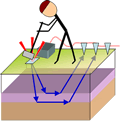 Electrical resistivity of subsurface materials is measured by causing an electrical current to flow in the earth between one pair of electrodes while the voltage across a second pair of electrodes is measured. The result is converted to an “apparent” resistivity which is a value representing the weighted average resistivity over a volume of the earth. Variations in this measurement are caused by variations in the soil, rock, and pore fluid electrical resistivity. Surveys require contact with the ground, so they can be labour intensive. Results are sometimes interpreted directly, but more commonly, 1D, 2D or 3D models are estimated using inversion procedures. When the survey is conducted in order to obtain a 1D model, it is called a sounding. Profiles are used to build 2D models of the earth. Multiple lines, or more complex electrode arrangements are used to obtain 3D interpretations. Soundings and profiles are defined as follows: