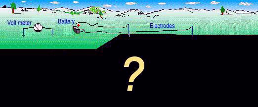 Current is injected into the ground, and resulting voltages are measured as electrode geometry varies. In this case, voltages get smaller as electrodes are separated further and further apart.