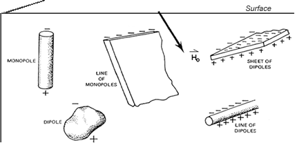 represented as monopoles, dipoles, lines of dipoles, sheets of charges etc.