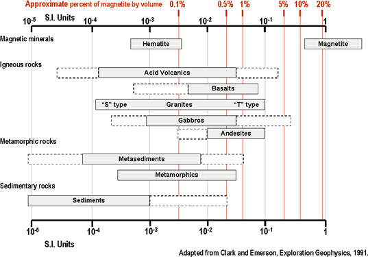 Charts showing the range of magnetic susceptibility values for common rock types are shown below. Note that the scale is logarithmic, indicating a large variability in magnetic susceptibility among rocks. From these charts we can infer several things: