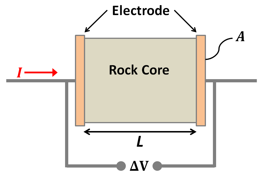 Next, a source is used to drive direct current (\(I\)) through the core sample. By measuring the voltage drop (\(\Delta V\)) accross the length of the sample, Ohm’s law can be used to determine the circuit resistance (\(R\)) caused by the rock: