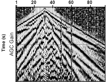 In shot gathers or on final sections we often have events that appear with a specific slope. Notice the ground roll, in the CSP gather below left. These are characterized by the late-arriving, high amplitude, low-frequency events which define a steep triangular-shaped central zone which mask the reflected arrivals.